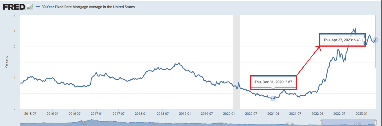 8. 2020년 말 미국의 30년 모기지 금리(대출 금리의 기준) 2.67%에서 2023년 4월 말 6.43%로 금리가 140% 상승함.