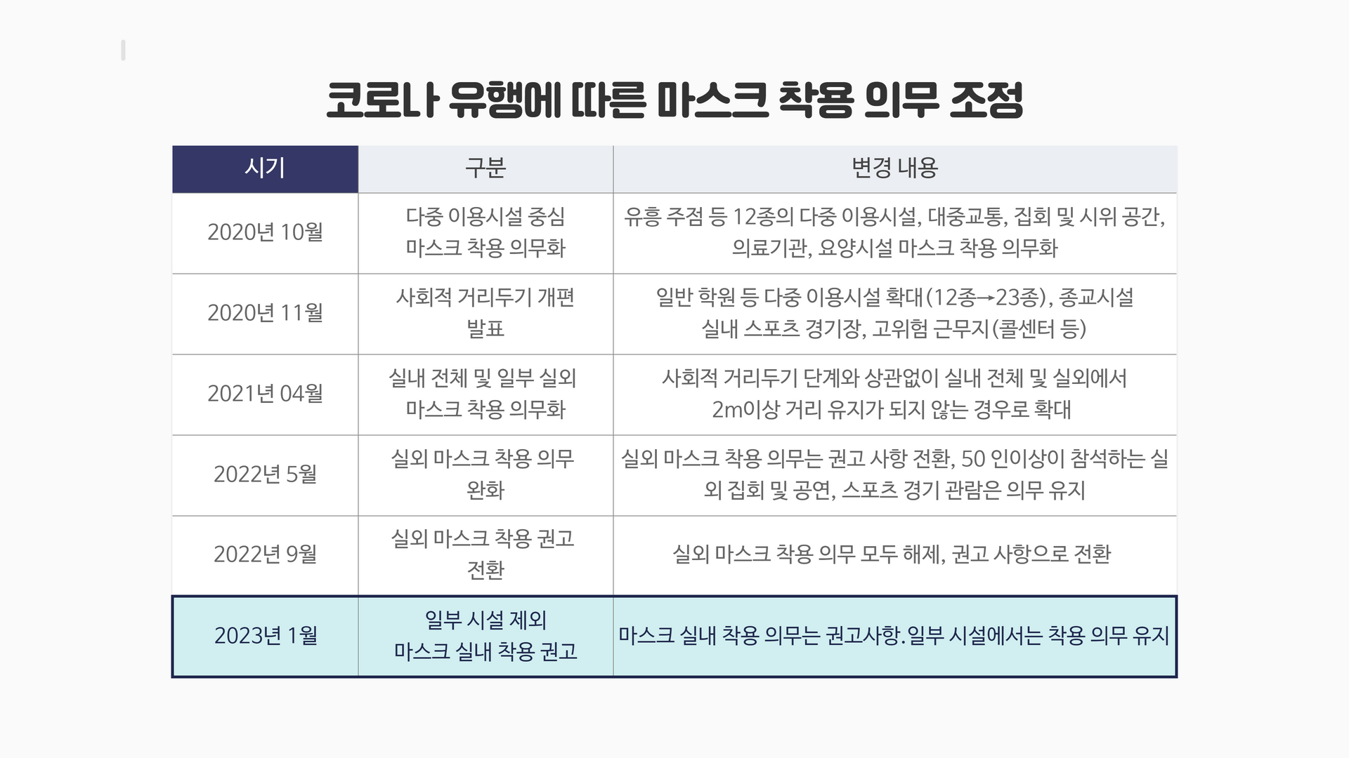14. 그러다 2023년 1월 30일, 실내 마스크에 대해 권고사항으로 변경되었음.