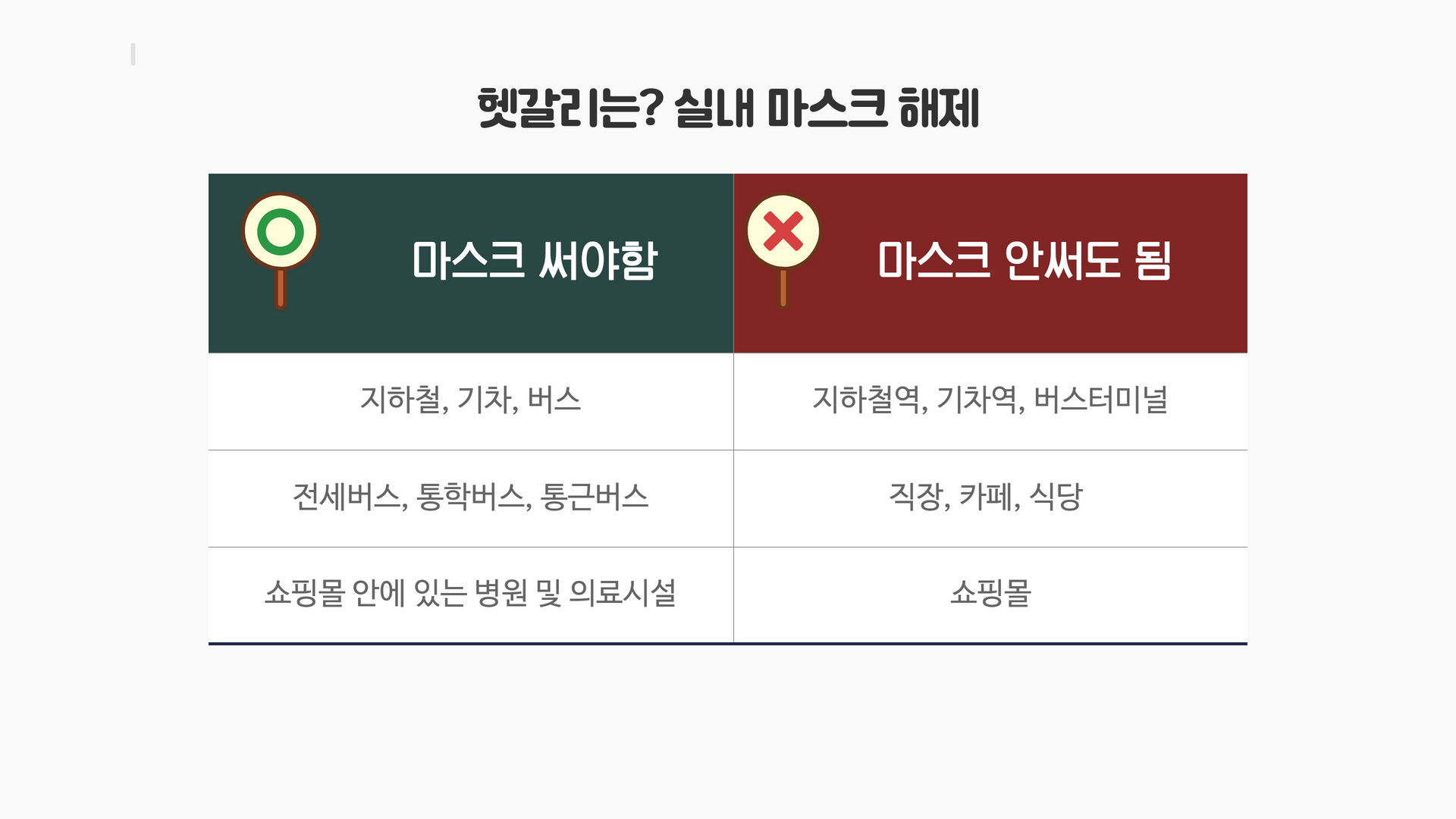 20. 대표적으로 지하철역에서는 마스크를 벗어도 되지만, 지하철 열차 안에서는 써야 함.